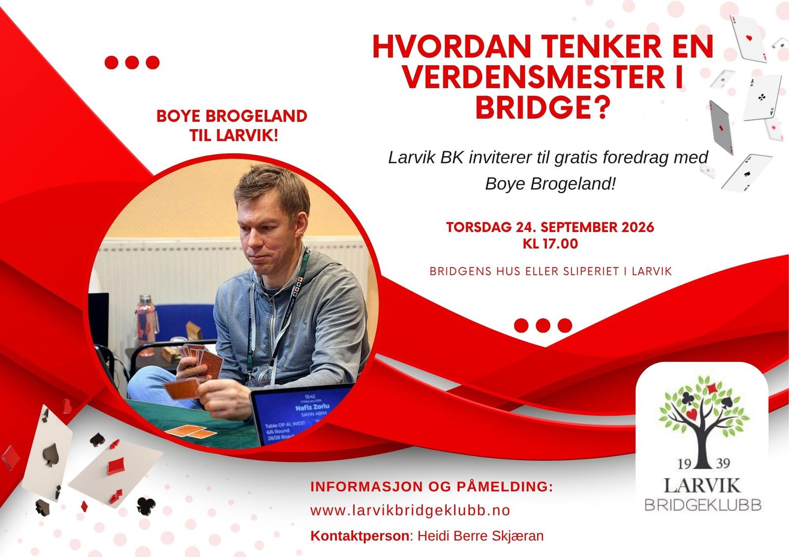 I slutten av september kommer Boye Brogeland til Larvik ifm NM parfinalen, og vi har vært så heldige å få han til å holde et foredrag torsdag 24. september.