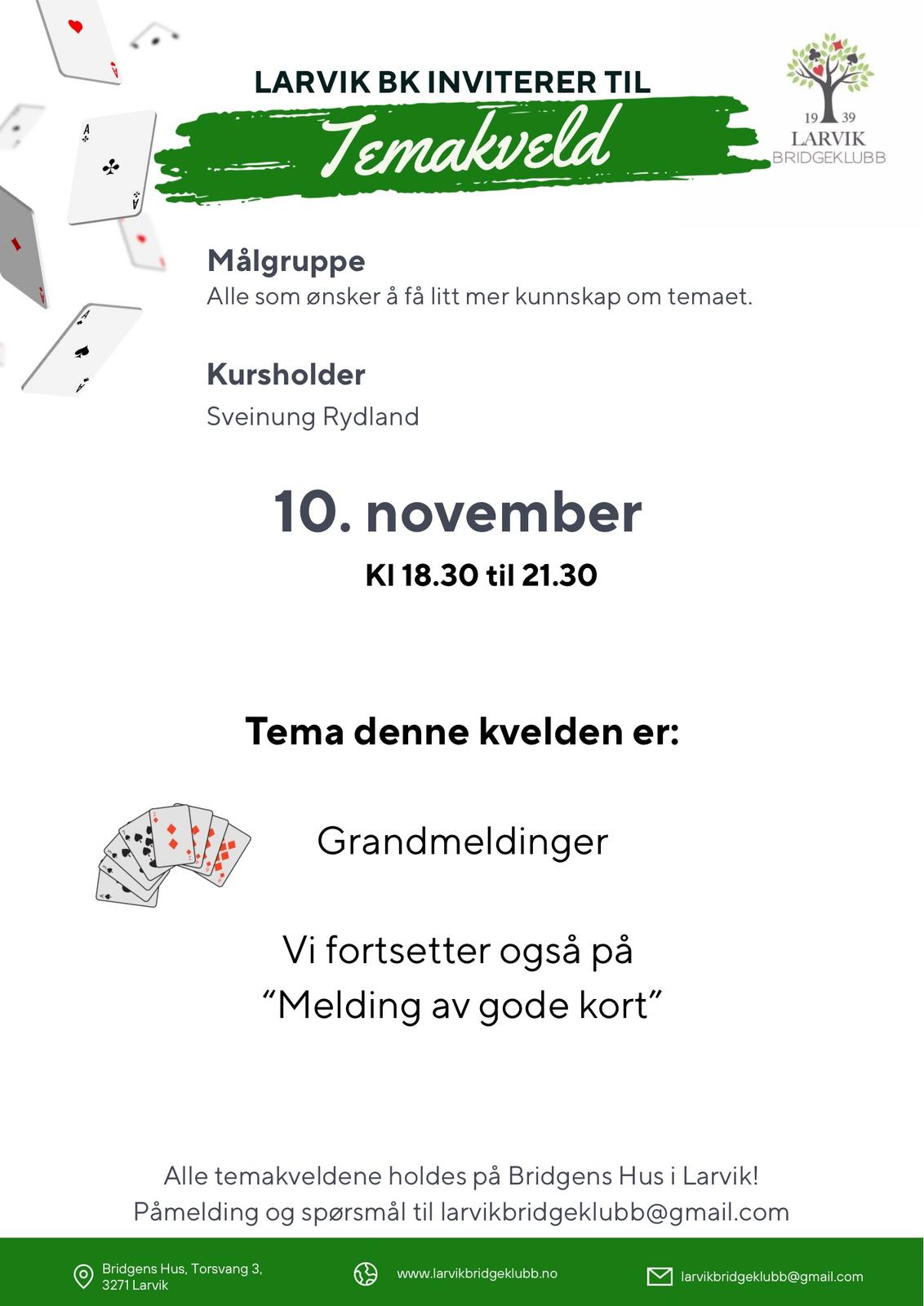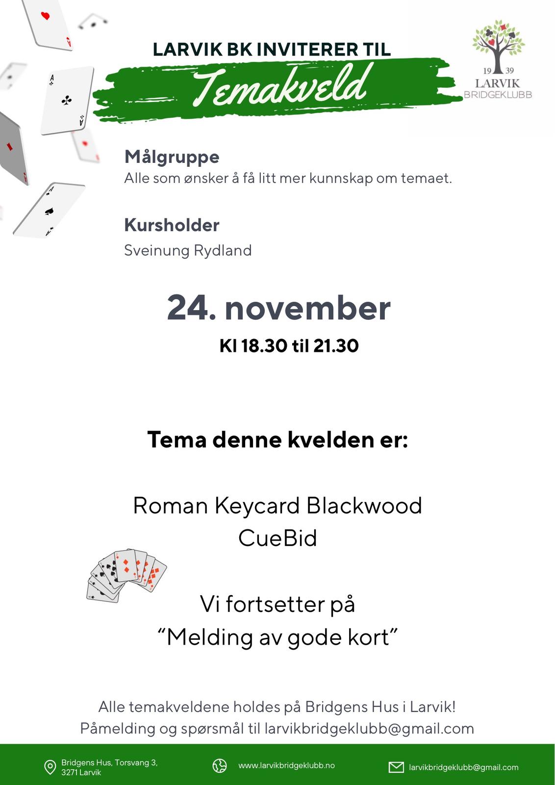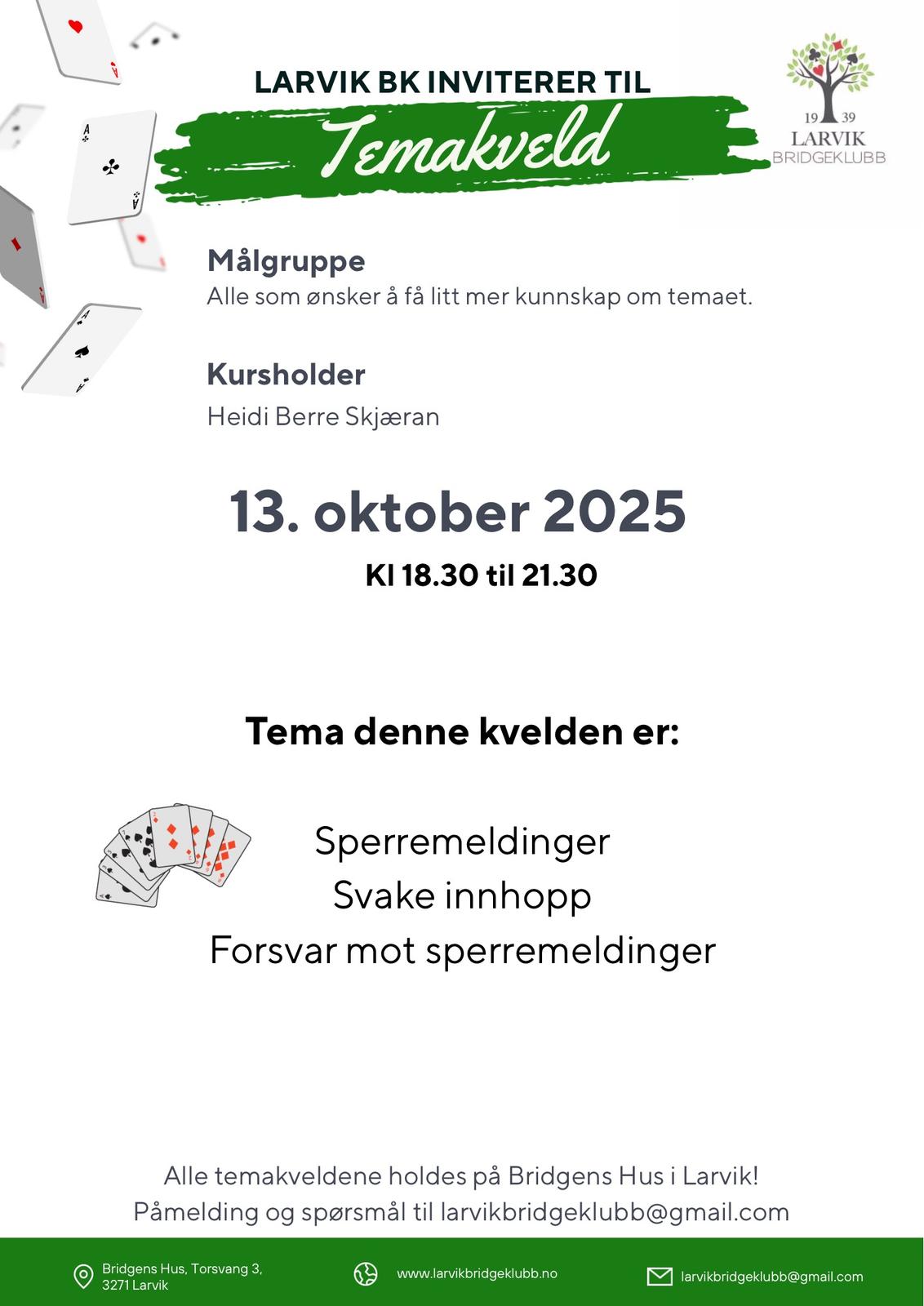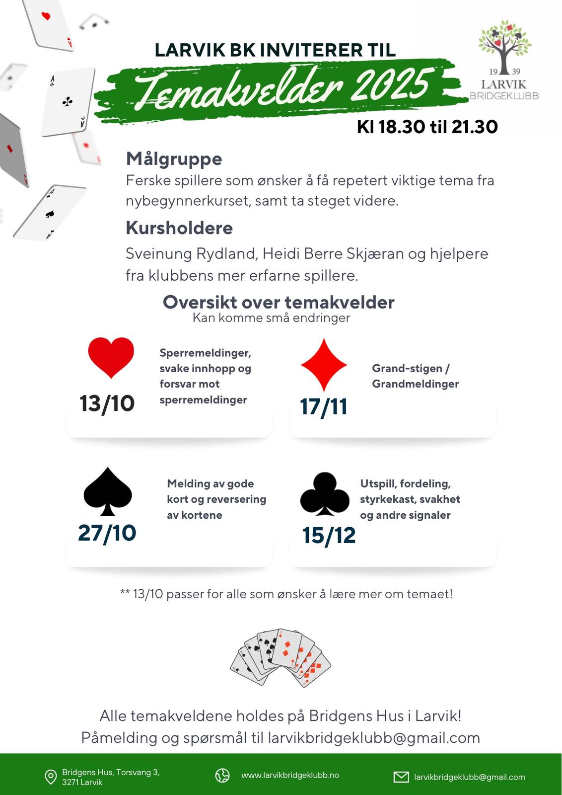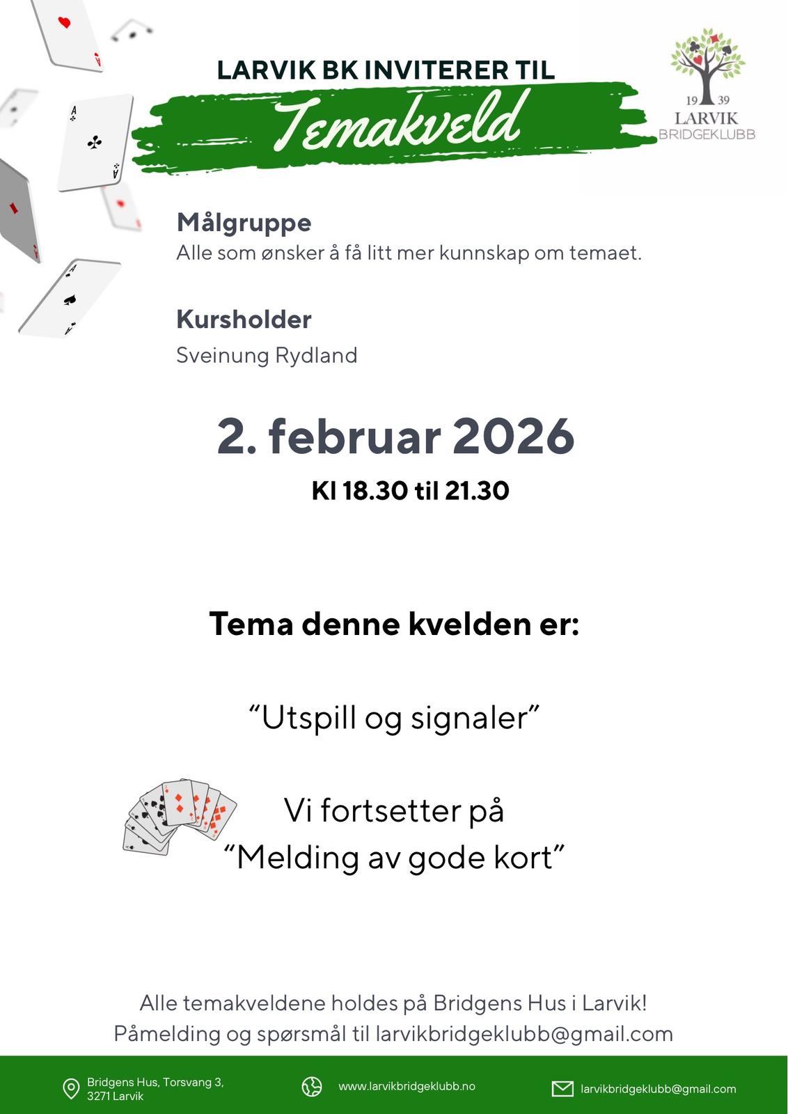 Påmelding til klubben på larvikbridgeklubb@gmail.com