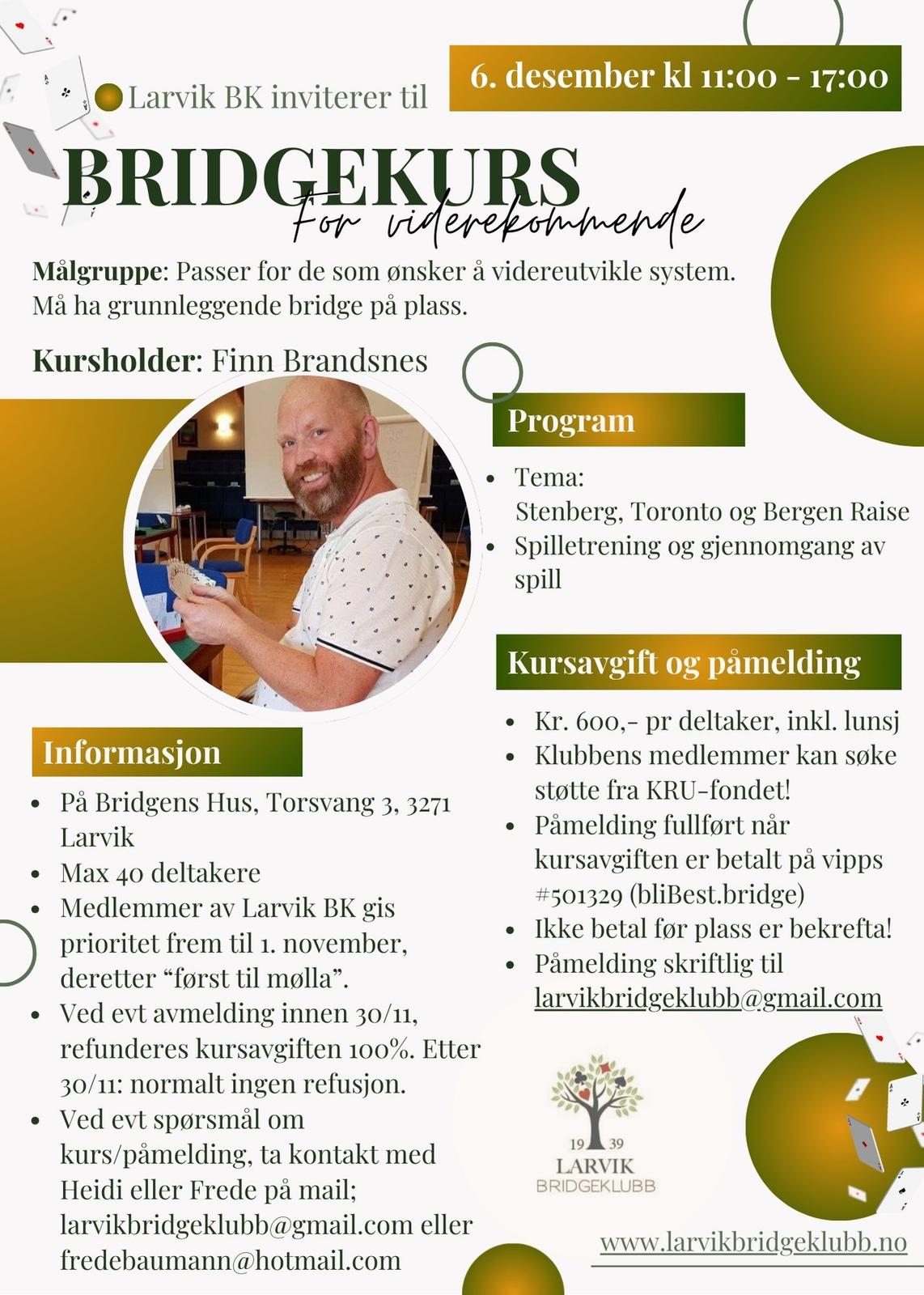 Lørdag 24. mai inviterer Larvik BK til bridgekurs for viderekommende.